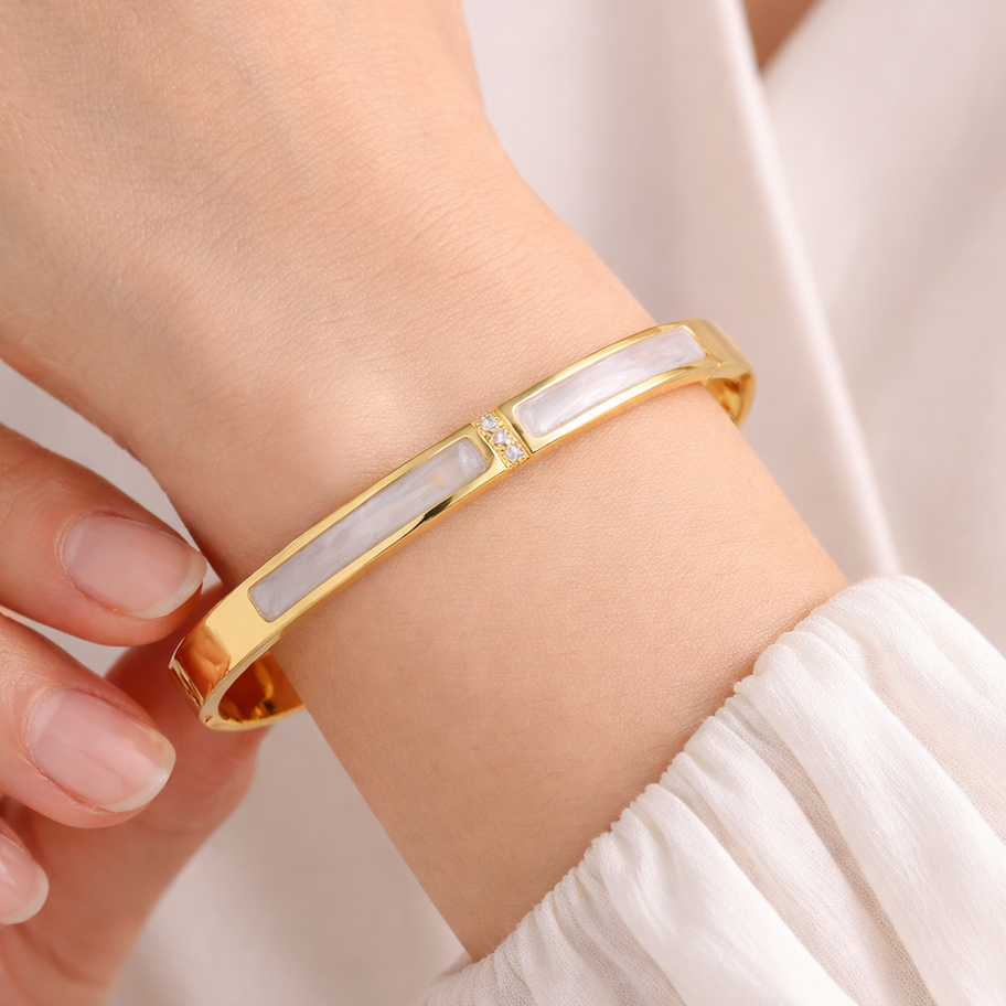 Elevate your style with this elegant gold bangle bracelet featuring delicate mother of pearl inlays and subtle crystal details. Designed for a refined and timeless look, this piece adds a touch of luxury to any outfit.